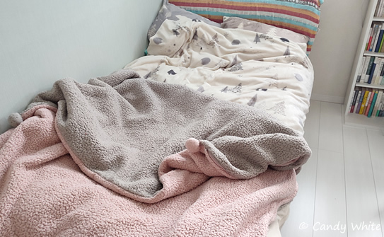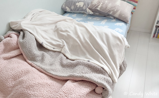 白い冬用かけ布団カバーはニトリでだいぶ前に買ったもの。これだけでは寒く、風がスースー入ってくるので、布団の上に、決して肌に触れないようにベアふわふわを掛けて寝ています。