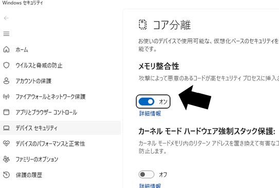 - 全てのアプリの動作確認後、「メモリ整合性」をオンに戻してPC再起動
